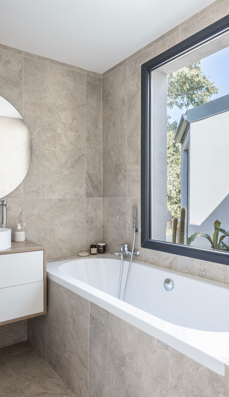 La villa de plain-pied s’ouvre largement sur l’extérieur et offre ainsi des cadres de vue sur une végétation luxuriante, invitant au voyage et à l’apaisement. Un petit havre de paix, intemporel et sobre, au sein duquel nous avons voulu remettre en lumière, à travers l’architecture et l’aménagement, les lignes nettes, les formes géométriques et le lien avec la nature environnante, l’ensemble faisant écho à l'architecture moderne de la maison originelle. Au niveau de l’entrée, l’extension met l'accent sur le lien entre le dehors et le dedans, grâce à une grande baie vitrée toute hauteur. Se rencontrent alors béton, pierre et bois, pour dégager une atmosphère au style brut et minimaliste et laisser place à la personnalité accueillante des propriétaires qui se disperse par touches subtiles dans toute la maison, grâce à la décoration ramenée des voyages et à l’ajout de tons chauds dans le mobilier choisi.